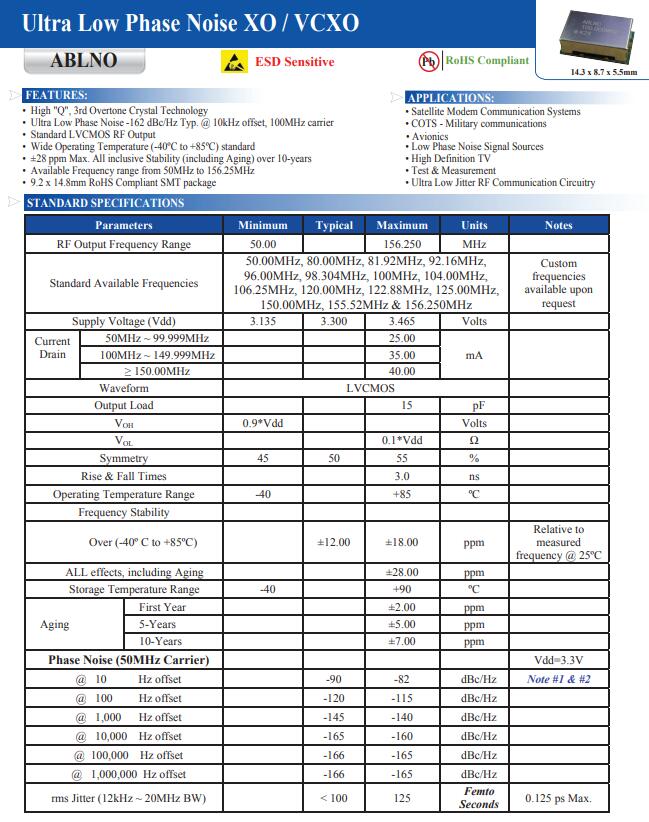 ABRACON旗艦ABLNO系列提供超低相位噪聲固定時(shí)鐘或電壓控制晶體振蕩器(VCXO)解決方案標(biāo)準(zhǔn)尺寸為9x14mm。同超過12 kHz的37fs典型RMS抖動(dòng)20MHz帶寬@ 100MHz載波,ABLNO是性能驅(qū)動(dòng)的理想選擇通訊,射頻,無線回程,和儀器應(yīng)用。