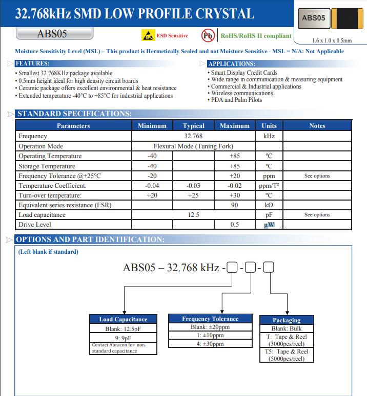 更多>>ABS05-32.768KHZ-X-3-T3,32.768KHz,4PF,25PPM,1610,-40~85℃