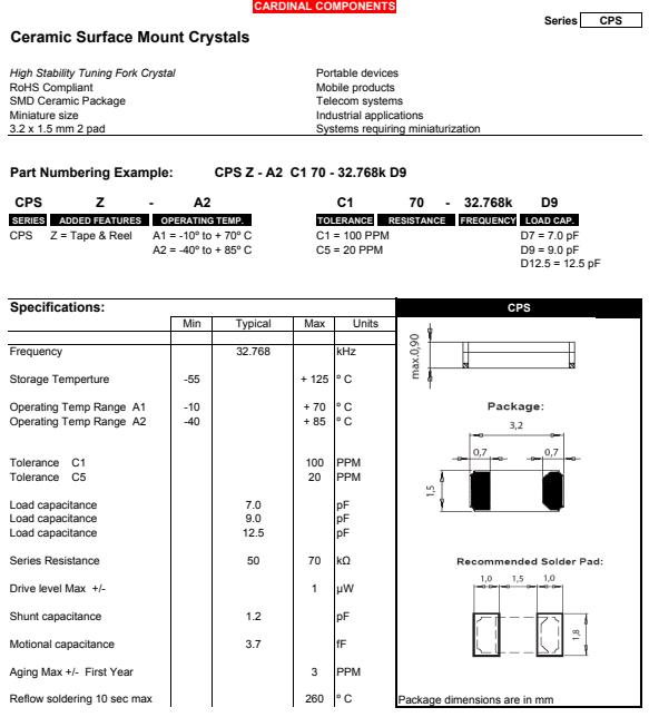 Cardinal晶振,CPS音叉晶體,GPSZ-A2C570-32.768K-D12.5晶振,貼片表晶32.768K系列具有超小型,薄型,質地輕的表面貼片音叉型石英晶體振蕩器,晶振產品本身具備優(yōu)良的耐熱性,耐環(huán)境特性,在辦公自動化,家電領域,移動通信領域可發(fā)揮優(yōu)良的電氣特性,符合無鉛標準,滿足無鉛焊接的回流溫度曲線要求,金屬外殼的石英晶振使得產品在封裝時能發(fā)揮比陶瓷晶振外殼更好的耐沖擊性能.