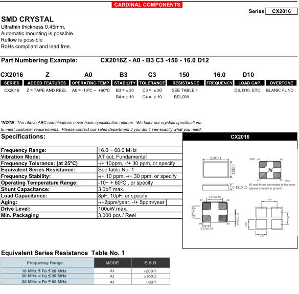 更多>>美國卡迪納爾晶振,CX2016貼片諧振器,CX2016Z-A0-B4C4-150-16.0D12晶振
