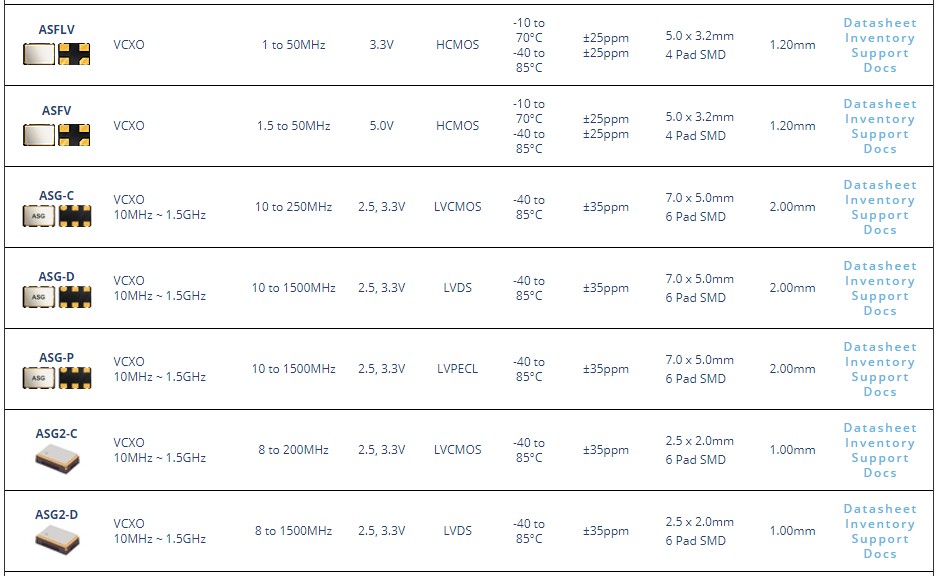 艾博康壓控晶振具有超低相位噪聲特點,具有低相位噪聲的VCXO晶振對于精確和高數(shù)據(jù)速率的RF應用是必需的.Abracon艾博康晶振,壓控晶振的超低相位噪聲ABLNO解決方案在100MHz偏移頻率和100MHz載波下實現(xiàn)-120dBc/Hz,為業(yè)界作出貢獻.以下為ASG-C-V-A-25.000MHZ壓控晶振參數(shù),以及相關型號,晶振代碼等資料參考.