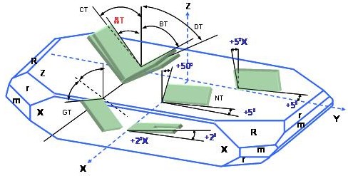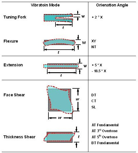 根據(jù)不同的應(yīng)用領(lǐng)域以及不同環(huán)境下產(chǎn)品的工作溫度要求,因此創(chuàng)造了多種多樣不同的石英晶振切割角度方式.比如AT-,BT-CT-DT-NT-GT-等多種不同的切割板片.不同的切割方向的板片具有不同的彈性常數(shù)張量,不用的壓電常數(shù)張量以及不同的介電常數(shù)張量.而這些張量在石英晶振,石英元件的設(shè)計(jì)以及應(yīng)用上展現(xiàn)了不同的振蕩以及溫度特性(如下圖所示),表現(xiàn)了在Z-plat石英結(jié)構(gòu)上,幾種不同方向的石英板片切割方式. 石英晶振的振動模態(tài)