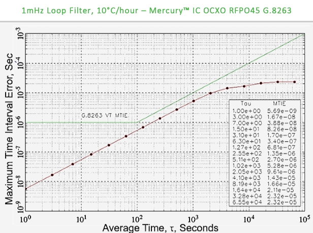對于基于數(shù)據(jù)包的同步,振蕩器的中期穩(wěn)定性要求是關(guān)鍵。傳統(tǒng)上,傳輸設(shè)備過去需要 Stratum 3 級穩(wěn)定性,以支持系統(tǒng)中 0.1Hz 至 10Hz 的環(huán)路帶寬?;?Packet 的 clocks 具有低得多的帶寬,為了滿足整個工作溫度范圍內(nèi)的 wander 生成指標,需要更穩(wěn)定的振蕩器。Rakon 與基于數(shù)據(jù)包的算法供應(yīng)商合作,測試振蕩器的各種環(huán)路帶寬,并對其進行調(diào)整以滿足標準要求。下面顯示了使用 Rakon 振蕩器在 1mHz 下完成的 MTIE 測試,該振蕩器符合標準掩碼。