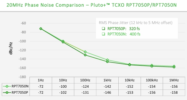 Rakon 與基帶 SoC 解決方案供應(yīng)商和無線電解決方案供應(yīng)商合作,以確保輕松滿足解決方案最佳性能的相位噪聲要求。以下是 Rakon 的 RPT 系列 TCXO 的典型相位噪聲圖,采用專利的 Pluto+ ™ 補償技術(shù)。