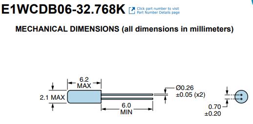 | E1WCDA06-32.768K | Fundamental | Watch Crystal 2.0mm x 6.0mm | ±20ppm | -10°C to +60°C | ±3ppm |