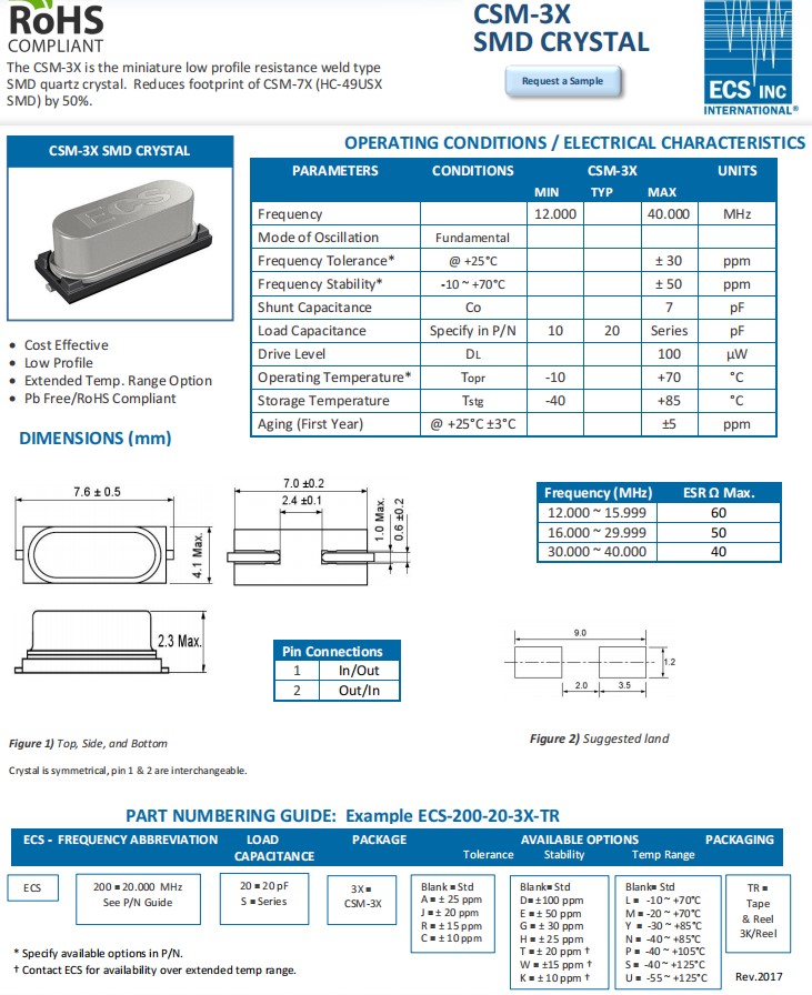 ECS-160-20-3X-TR,CSM-3X,ECS車載控制器晶振,16MHz晶振,美國進(jìn)口晶振,伊西斯晶振,ECS晶振,型號:CSM-3X,編碼為:ECS-160-20-3X-TR,頻率:16.000MHz,小體積尺寸:7.6x4.1mm封裝,CSM-3X是一種小型低輪廓電阻焊縫型SMD石英晶體,將CSM-7X(HC-49USX SMD)的占用空間減少50%。無源晶振,石英晶振,兩腳貼片晶振,石英晶體諧振器,橢圓型晶振,適用于移動通訊設(shè)備,無線網(wǎng)絡(luò)晶振,藍(lán)牙模塊晶振,汽車電子晶振,車載晶振,數(shù)碼電子晶振,物聯(lián)網(wǎng)等應(yīng)用。
