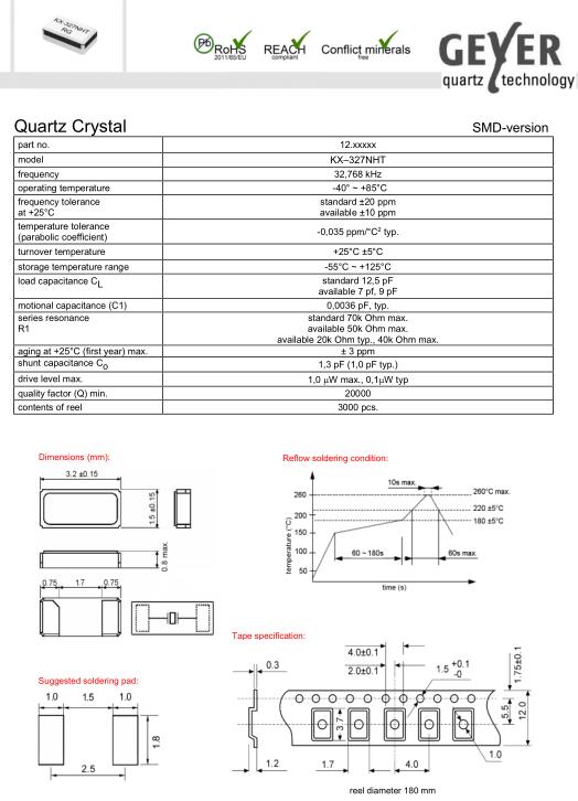 GEYER格耶晶振,KX-327NHT兩腳晶振,SMD晶振,32.768K時(shí)鐘晶體具有小型,薄型,輕型的貼片晶振,,貼片型表面音叉型晶體振蕩器,產(chǎn)品具有優(yōu)良的耐熱性,耐環(huán)境特性,可發(fā)揮晶振優(yōu)良的電氣特性,符合RoHS規(guī)定,滿足無鉛焊接的高溫回流溫度曲線要求,金屬外殼的封裝使得產(chǎn)品在封裝時(shí)能發(fā)揮比陶瓷振蕩器外殼更好的耐沖擊性.