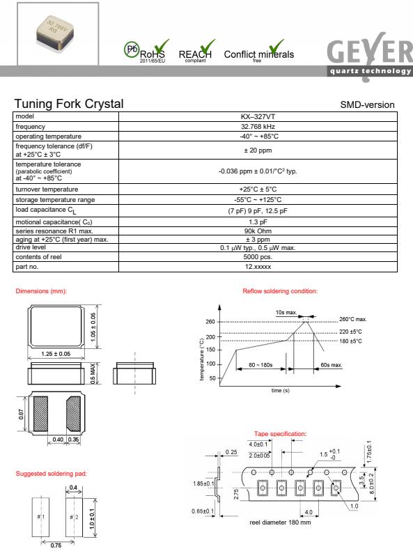 德國格耶晶振,KX-327VT無源晶體,超小型晶振,貼片表晶32.768K系列具有超小型,薄型,質(zhì)地輕的表面貼片音叉型石英晶體振蕩器,晶振產(chǎn)品本身具備優(yōu)良的耐熱性,耐環(huán)境特性,在辦公自動化,家電領(lǐng)域,移動通信領(lǐng)域可發(fā)揮優(yōu)良的電氣特性,符合無鉛標(biāo)準(zhǔn),滿足無鉛焊接的回流溫度曲線要求,金屬外殼的石英晶振使得產(chǎn)品在封裝時能發(fā)揮比陶瓷晶振外殼更好的耐沖擊性能.