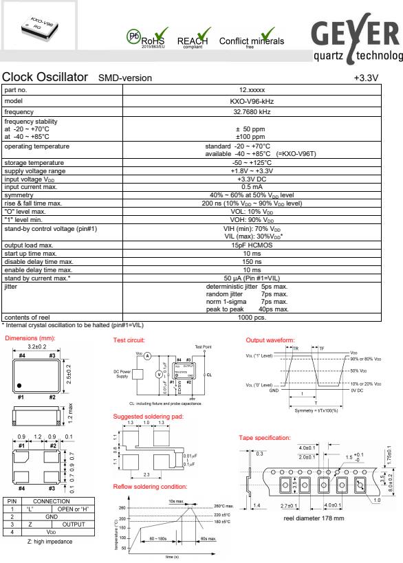 GEYER進口晶振,KXO-V96-kHz低抖動晶振,時鐘振蕩器,小體積SMD時鐘振蕩器,是貼片音叉晶體,千赫頻率元件,應(yīng)用于時鐘模塊,智能手機,全球定位系統(tǒng),因產(chǎn)品本身體積小,SMD編帶型,可應(yīng)用于高性能自動貼片焊接,被廣泛應(yīng)用到各種小巧的便攜式消費電子數(shù)碼時間產(chǎn)品,環(huán)保性能符合ROHS/無鉛標(biāo)準(zhǔn).