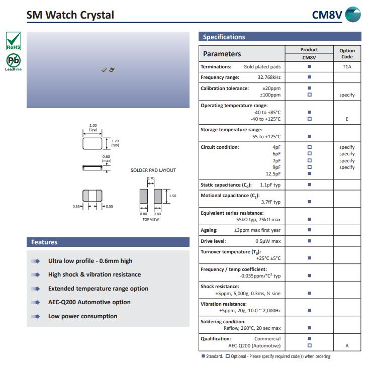 Golledge晶振,CM8V晶振,2012二腳晶振此款SMD晶體并且可以承受回流焊接的高溫,波峰焊接,回流焊接等,貼片表晶主要特點(diǎn)是該產(chǎn)品排帶包裝,焊接模式主要使用SMT焊接,給現(xiàn)代SMT工藝帶來高速的工作效率,32.768K系列產(chǎn)品本身具有體積小,厚度薄,重量輕等特點(diǎn),此音叉型石英晶體諧振器,晶振產(chǎn)品本身具備優(yōu)良的耐熱性,耐環(huán)境特性,在辦公自動(dòng)化,家電領(lǐng)域,移動(dòng)通信領(lǐng)域可發(fā)揮優(yōu)良的電氣特性,符合無鉛標(biāo)準(zhǔn),滿足無鉛焊接的回流溫度曲線要求,金屬外殼的石英晶振使得產(chǎn)品在封裝時(shí)能發(fā)揮比陶瓷晶振外殼更好的耐沖擊性能.