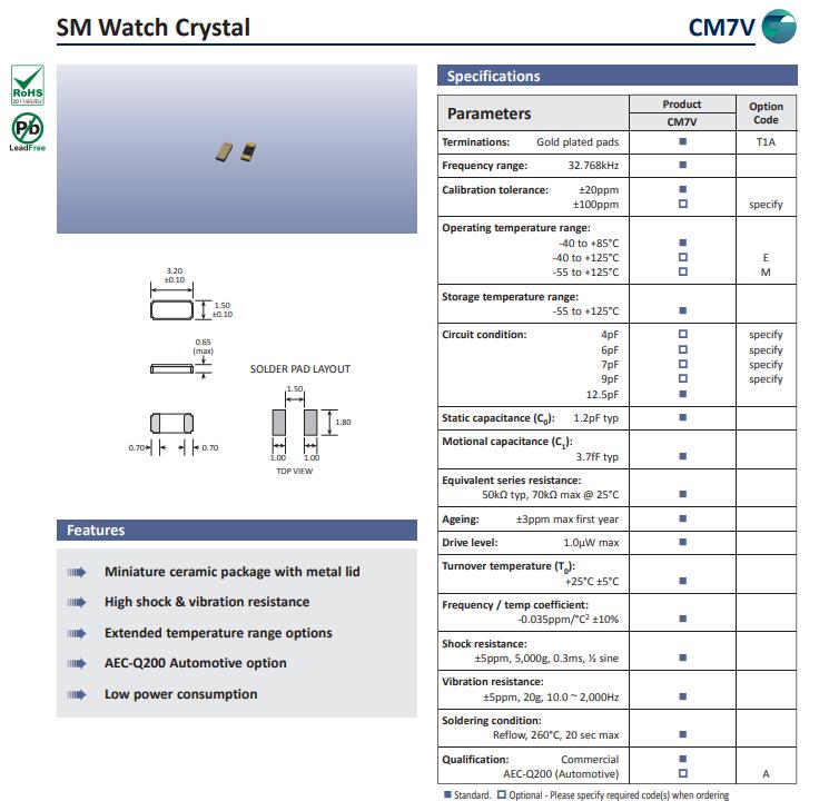 高利奇晶振,CM7V晶振,32.768K晶振此款SMD晶體并且可以承受回流焊接的高溫,波峰焊接,回流焊接等,貼片表晶主要特點(diǎn)是該產(chǎn)品排帶包裝,焊接模式主要使用SMT焊接,給現(xiàn)代SMT工藝帶來高速的工作效率,32.768K系列產(chǎn)品本身具有體積小,厚度薄,重量輕等特點(diǎn),此音叉型石英晶體諧振器,晶振產(chǎn)品本身具備優(yōu)良的耐熱性,耐環(huán)境特性,在辦公自動化,家電領(lǐng)域,移動通信領(lǐng)域可發(fā)揮優(yōu)良的電氣特性,符合無鉛標(biāo)準(zhǔn),滿足無鉛焊接的回流溫度曲線要求,金屬外殼的石英晶振使得產(chǎn)品在封裝時能發(fā)揮比陶瓷晶振外殼更好的耐沖擊性能.