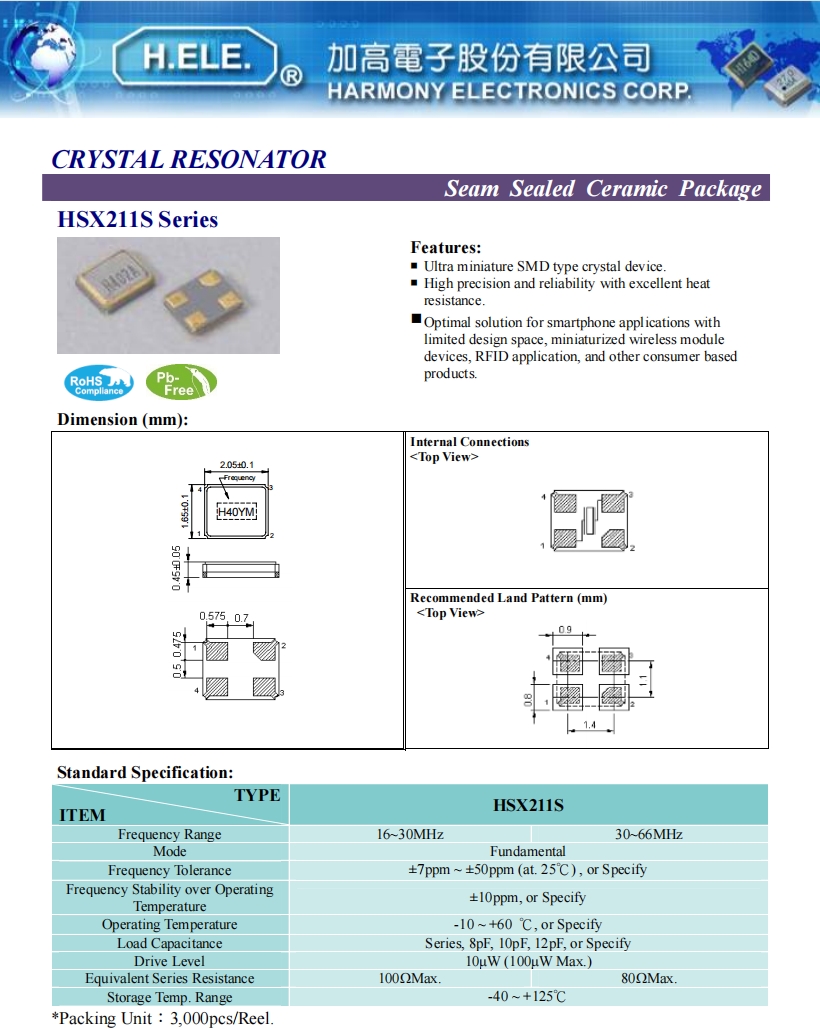 | X2C017000BA1HA-U | HELE晶振 | HSX211S | 17MHz | 10pF | ±10PPM | ±20PPM |