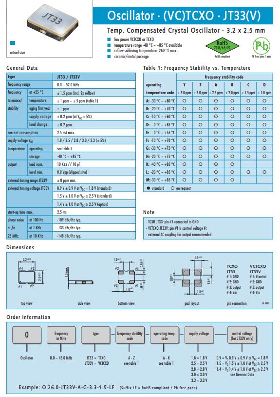更多>>Jauch晶振,JT33,JT33V晶振,3225溫補(bǔ)晶振