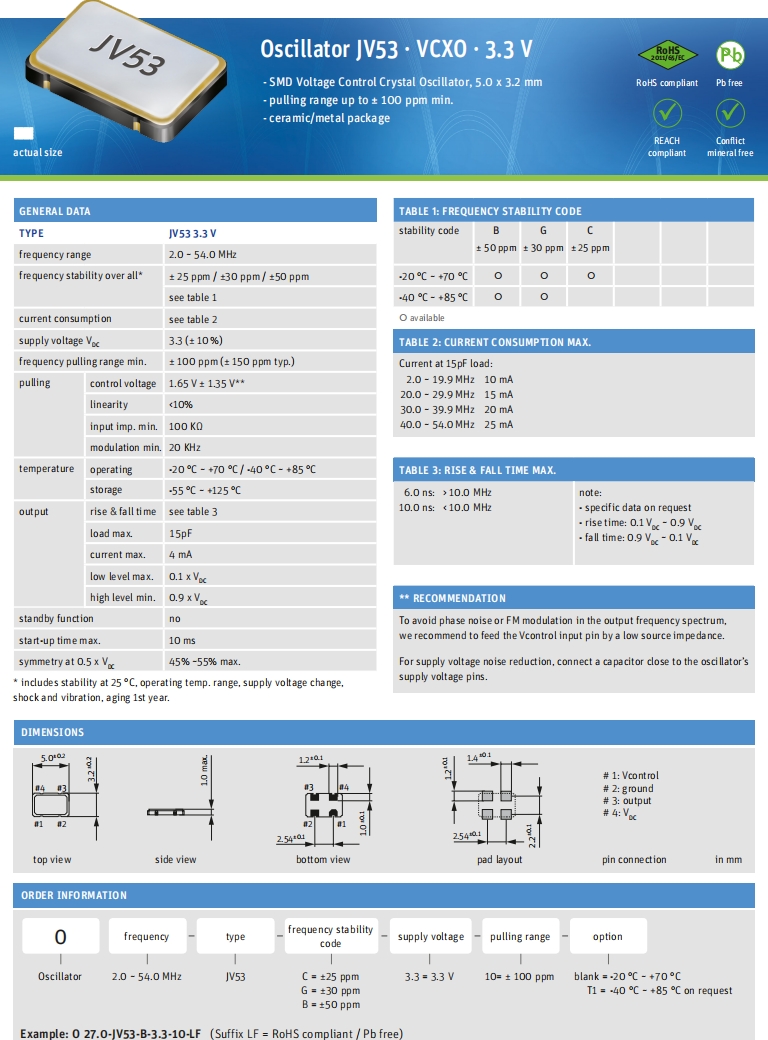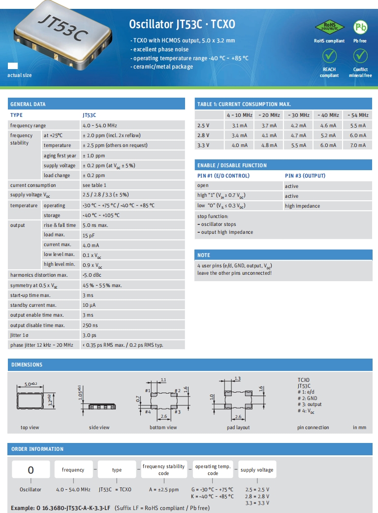 Jauch溫補(bǔ)晶振,O 26.0-JT53C-A-G-3.3-LF,6G移動(dòng)無(wú)線電晶振規(guī)格表