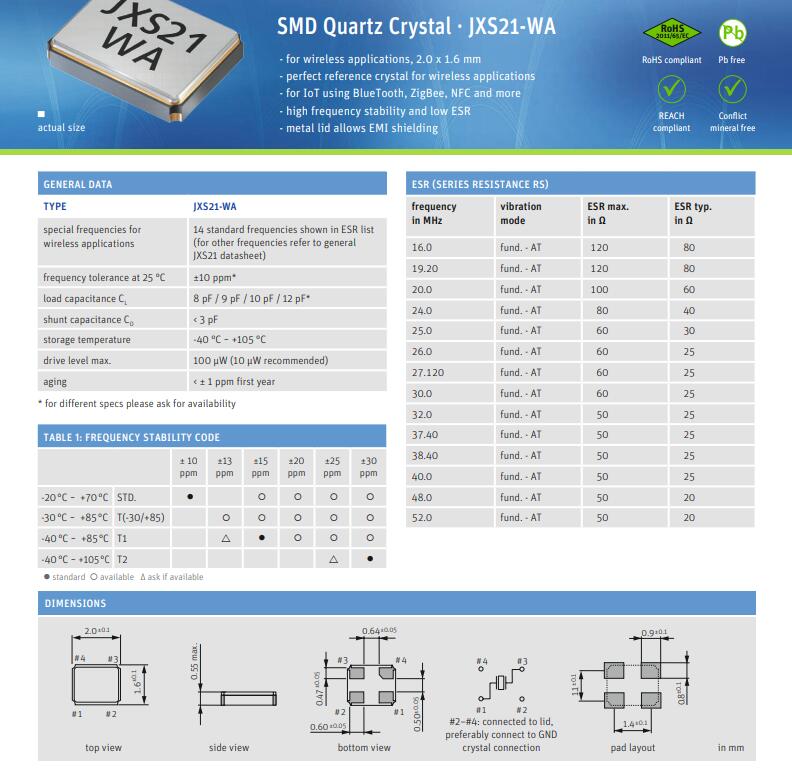 更多>>Jauch晶振,JXS21-WA晶振,2016小體積晶振