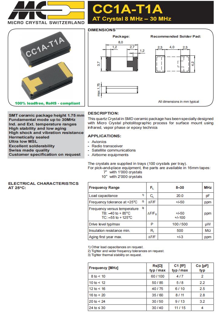 Micro進(jìn)口晶振|CC1A-T1A-18.000MHz-20.0pF-100ppm-TA-QI|6G無(wú)線通信晶振規(guī)格表