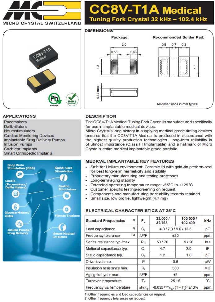 CC8V-T1A-32.768kHz-12.5pF-20ppm-TB-QM,2012mm音叉晶體,醫(yī)療設(shè)備專用晶振,CC8V-T1A醫(yī)用音叉晶體,無源晶振,編碼CC8V-T1A-32.768kHz-12.5pF-20ppm-TB-QM,是專門為植入式醫(yī)療設(shè)備制造的,Micro Crystal在提供醫(yī)療級計時設(shè)備方面的悠久歷史確保了CC8V-T1A醫(yī)療按照最高質(zhì)量的生產(chǎn)技術(shù)生產(chǎn),頻率32.768KHz,尺寸2012mm音叉,負(fù)載12.5pF,是醫(yī)療設(shè)備專用晶振,可用于心臟起搏器,去纖顫器,耳蝸植入設(shè)備等產(chǎn)品.