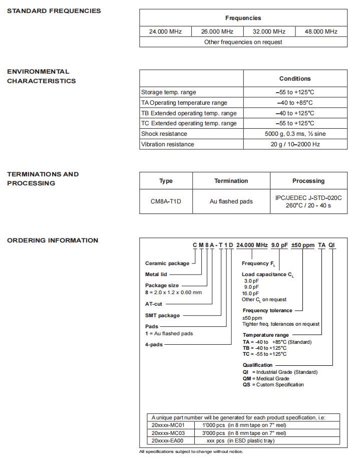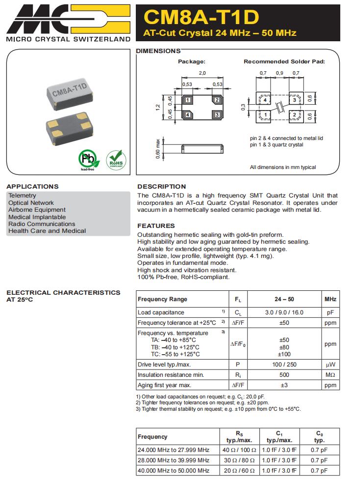 CM8A-T1D-27.000MHz-16.0pF-50ppm-TB-QI|2012四腳貼片晶振|6G光纖通道晶振,瑞士微晶晶振,CM8A-T1D石英晶體諧振器,CM8A-T1D-27.000MHz-16.0pF-50ppm-TB-QI晶振,2012四腳貼片晶振,頻率27MHz,負(fù)載16pf,頻率穩(wěn)定性50ppm,工作溫度-40~125°C,低老化振,高可靠性晶振,6G光纖通道晶振,醫(yī)用植入式晶振,無線電通信設(shè)備晶振,家用保健和醫(yī)療設(shè)備晶振.
