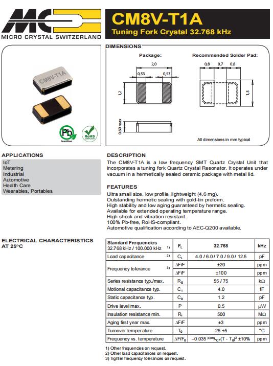 | CM8V-T1A-32.768k-12.5pF-20PPM-TA-QA | Micro 晶振 | 晶體 32.768 kHz 12.5 pF +/-20 PPM AEC-Q200 | Crystals |