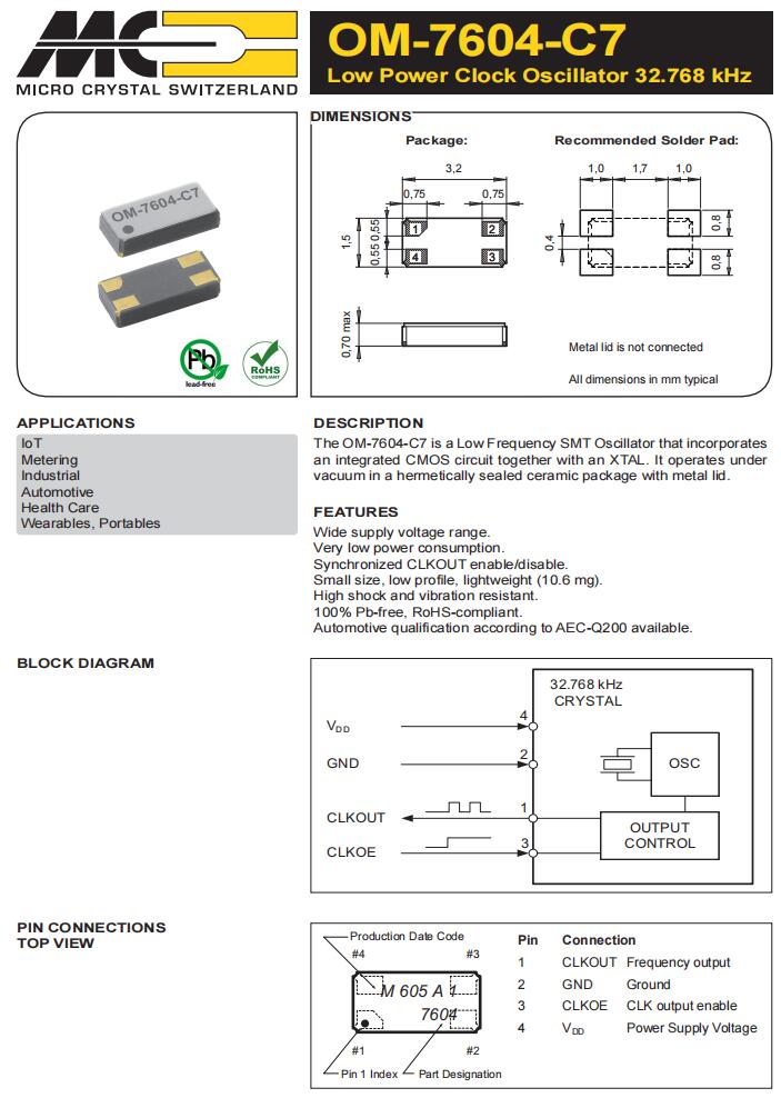| OM-7604-C7-32.768kHz-20PPM-TB-QC | Micro Crystal | 標(biāo)準(zhǔn)時(shí)鐘振蕩器 32.768 kHz +/-20 PPM -40/+125C |