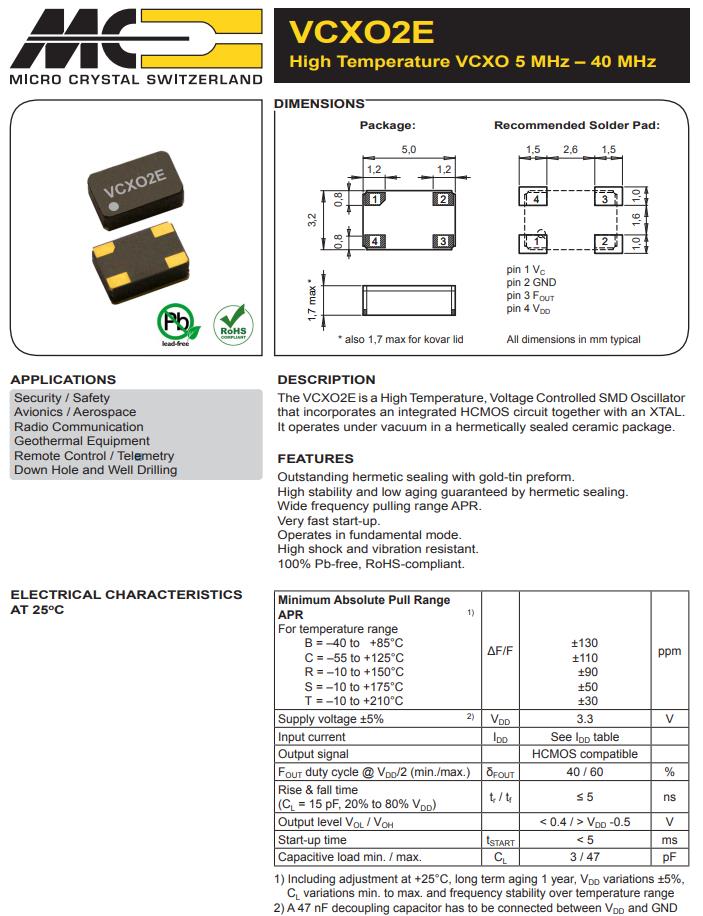 VCX02EV-C-48.000MHz-T3|高溫壓控振蕩器|6G模塊晶振,Micro進口晶振,VCX02E有源晶振,VCX02EV-C-48.000MHz-T3晶振,5032mm晶振,高溫壓控振蕩器,頻率48MHz,電壓3.3V,頻率穩(wěn)定性110ppm,工作溫度-55~125°C,高穩(wěn)定性晶振,高抗沖擊晶振,6G模塊晶振,地?zé)嵩O(shè)備晶振,遠程遙控晶振,井下和鉆井應(yīng)用晶振.