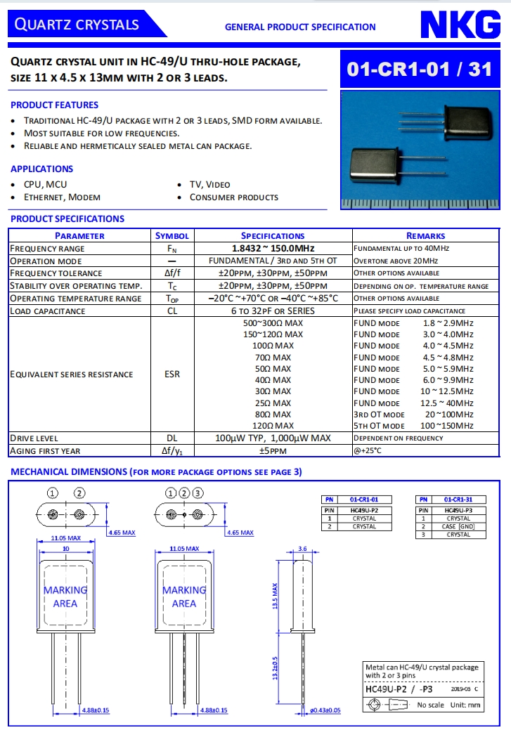 更多>>NKG晶振|01-CR1-31-20M000-T18-3050E-EXT|三腳插件晶振