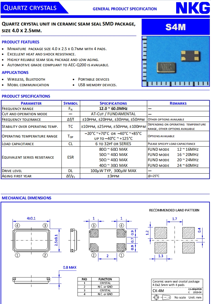 NKG Crystal|S4M52.000F20E2Z-EXT|6G移動通信晶振規(guī)格表