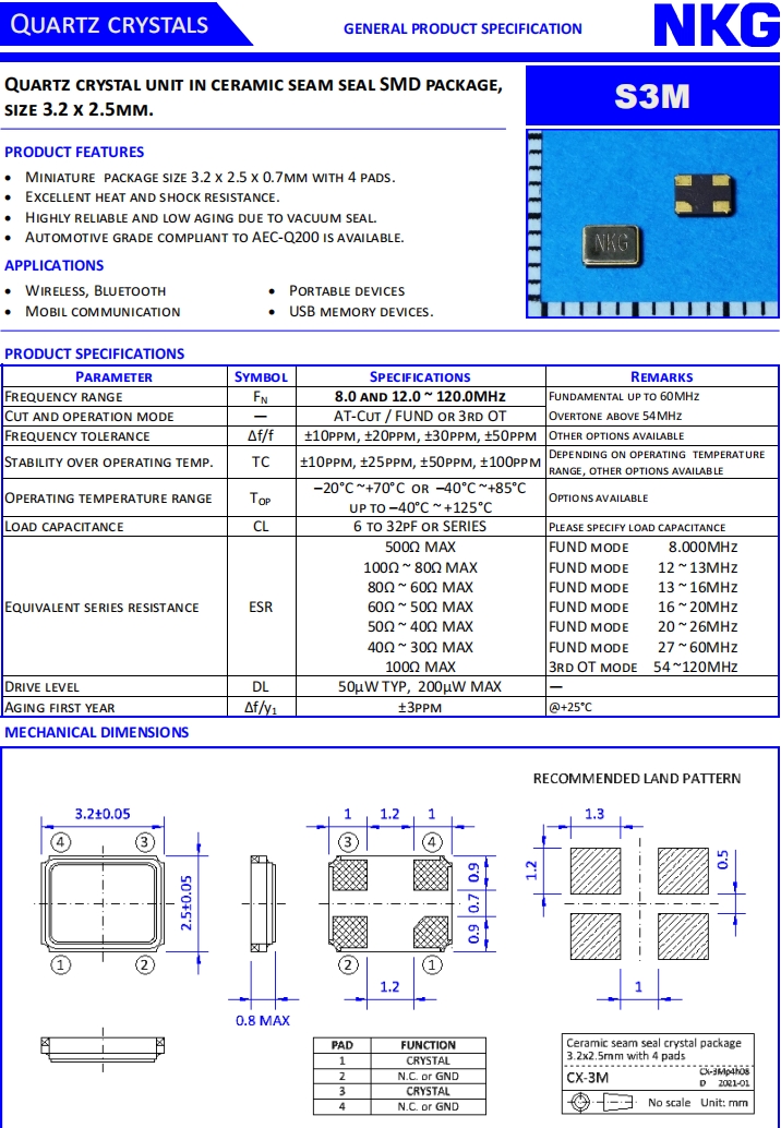 NKG晶振|S3M48.000F18M23-EXT|3225小體積晶振規(guī)格表
