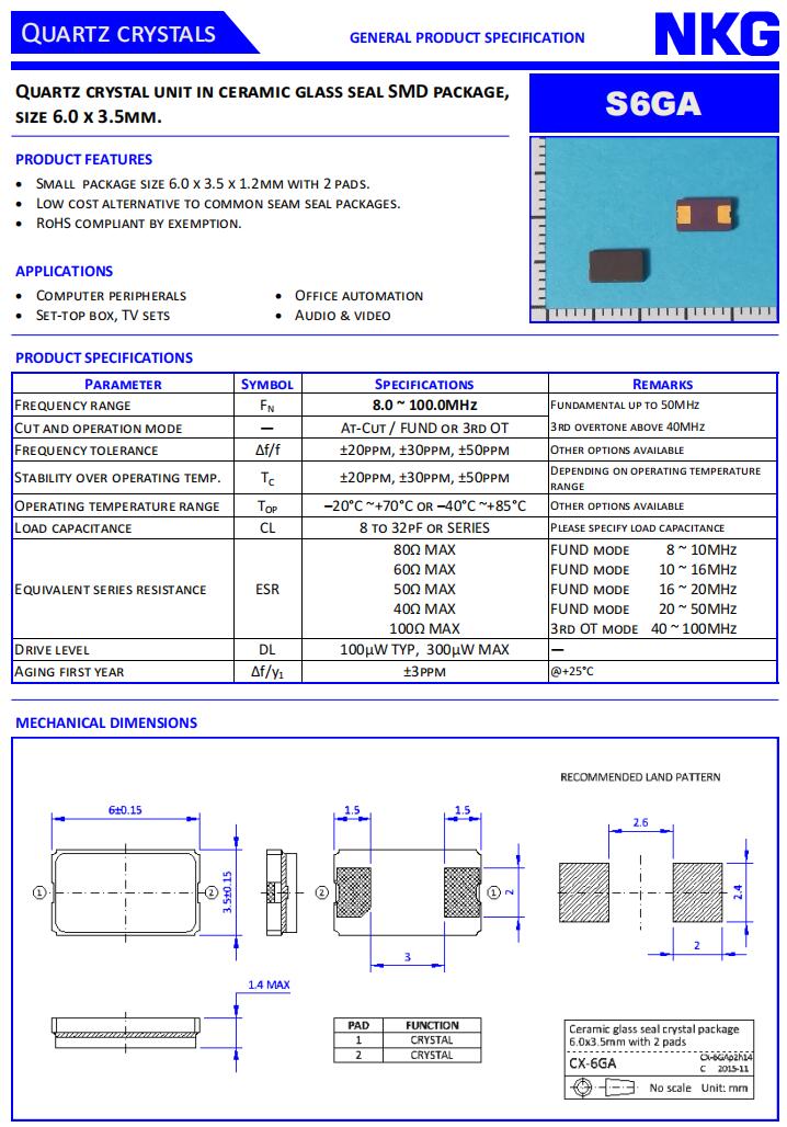 NKG晶振|S6GA20.000F12M2Z-EXT|6035低成本晶振規(guī)格表