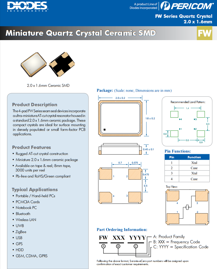 FW1600008 Diodes晶振 FW 16 MHz ±20ppm ±10ppm 12pF
