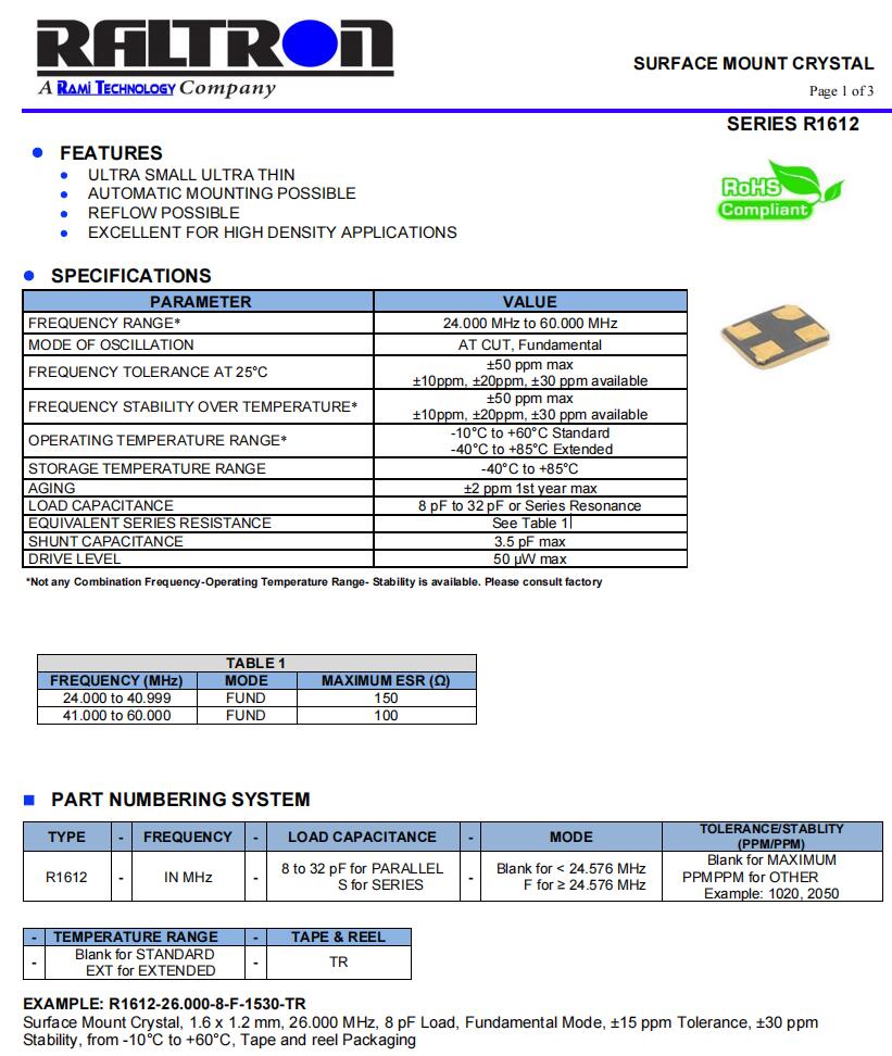 | R1612-25.000-9-F-3030-TR | R1612 | 25.000MHz | 1.6 x 1.25mm | ± 30 ppm | ± 30 ppm | 9 pF | -10°C~+60°C |