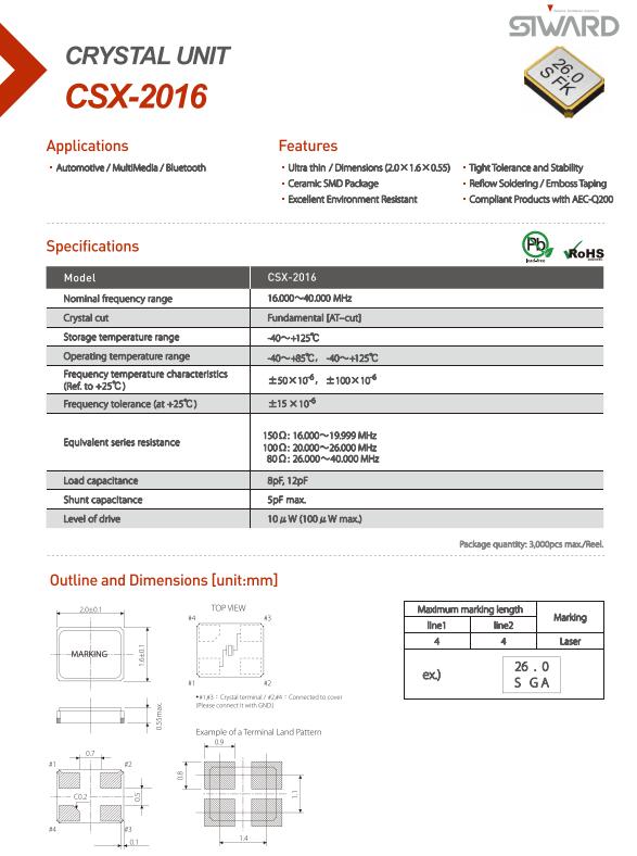 臺灣希華晶振,CSX-2016晶振,2016小體積晶振,外觀尺寸具有薄型表面貼片型石英晶體諧振器,特別適用于有小型化要求的市場領(lǐng)域,比如智能手機,無線藍牙,平板電腦等電子數(shù)碼產(chǎn)品.晶振本身超小型,薄型,重量輕,晶體具有優(yōu)良的耐環(huán)境特性,如耐熱性,耐沖擊性,在辦公自動化,家電相關(guān)電器領(lǐng)域及Bluetooth,Wireless LAN等短距離無線通信領(lǐng)域可發(fā)揮優(yōu)良的電氣特性,滿足無鉛焊接的回流溫度曲線要求.