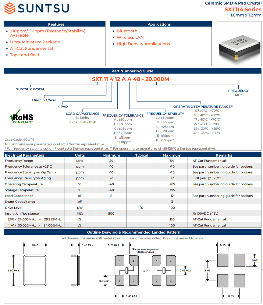 | SXT11410BA38-24.000M | 1.6X1.2 SMD (4 PAD) CRYSTAL | 10pF | ±30ppm | 24.000M |