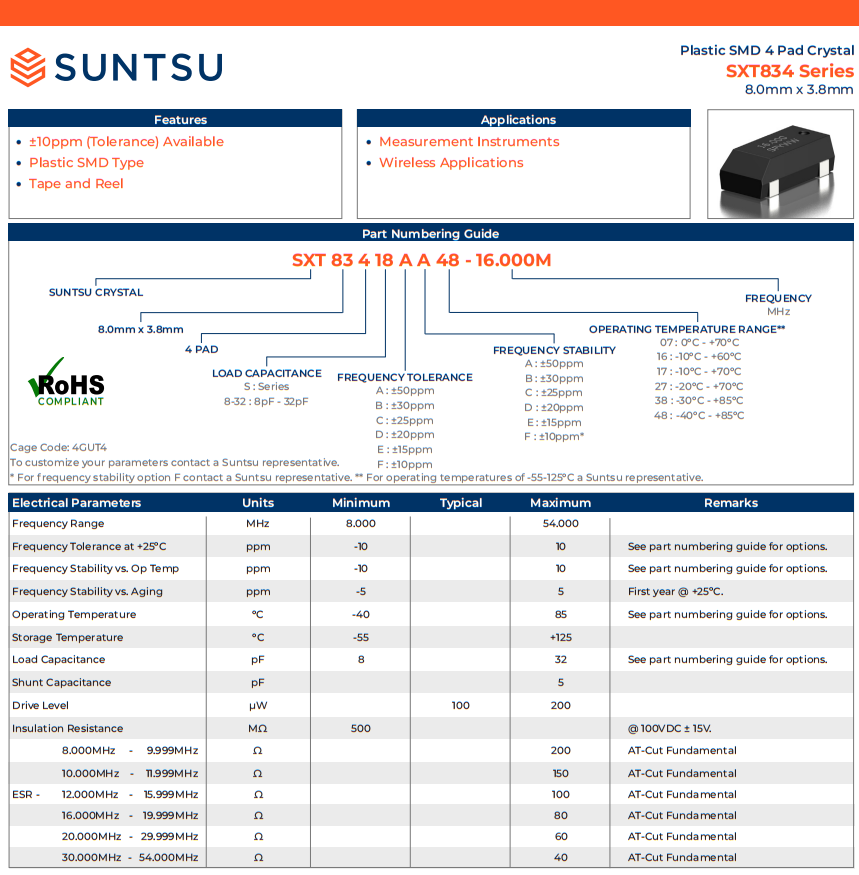 | SXT83418AA07-24.000M | 8.0X3.8 PLASTIC SMD (4 PAD) Crystal | 18pF | ±50ppm | 24.000M |