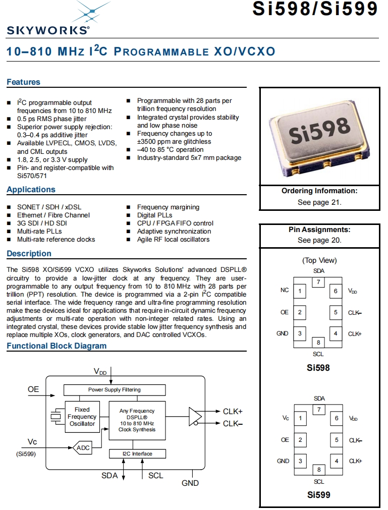 | 598ACA000121DGR | Skyworks Solutions Inc. | Si598 | 100 MHz | LVPECL | 3.3V | ±20ppm |