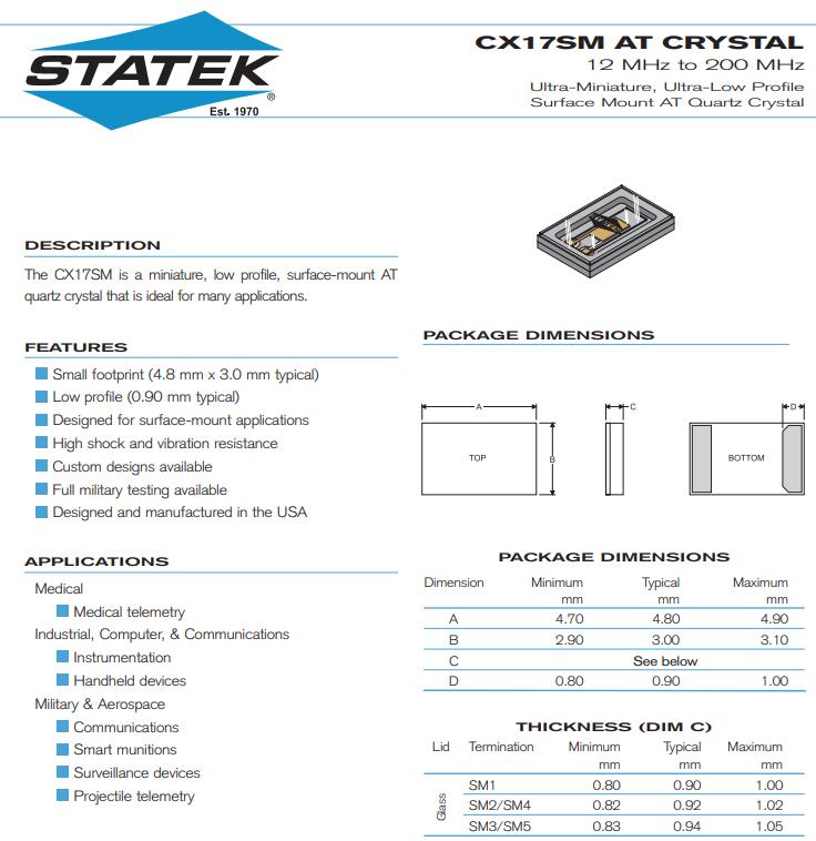 美國STATEK晶振,CX17SM晶振,二腳晶體諧振器貼片晶振本身體積小,超薄型石英晶體諧振器,特別適用于有目前高速發(fā)展的高端電子數(shù)碼產(chǎn)品,因?yàn)榫д癖旧硇⌒突枨蟮氖袌鲱I(lǐng)域,小型?薄型是對應(yīng)陶瓷諧振器(偏差大)和普通的石英晶體諧振器(偏差小)的中間領(lǐng)域的一種性價(jià)比較出色的產(chǎn)品.產(chǎn)品廣泛用于筆記本電腦,無線電話,衛(wèi)星導(dǎo)航HDD, SSD, USB, Blu-ray等用途,符合無鉛焊接的高溫回流焊曲線特性.