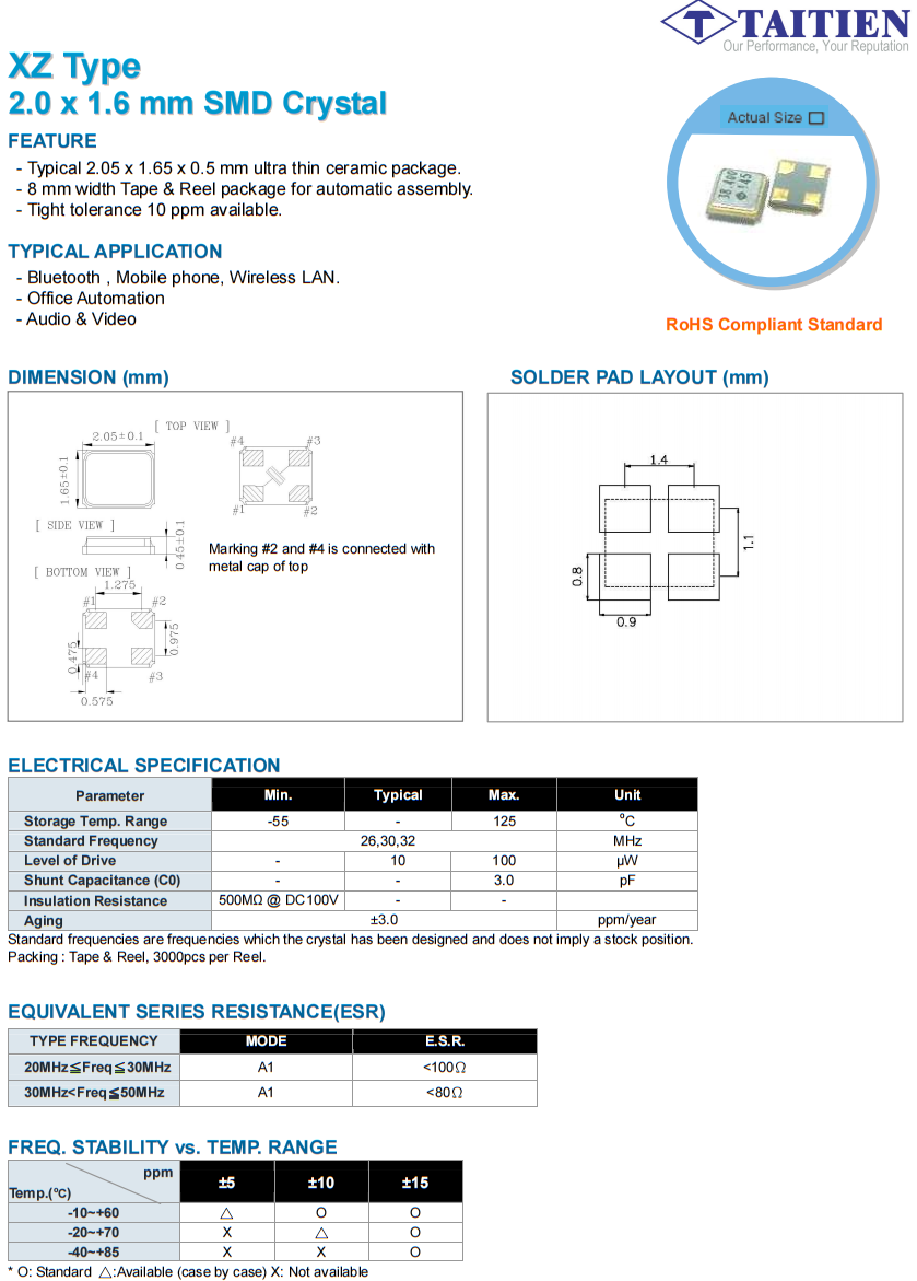 XZDPPLNANF-32.000000|32MHz|15PPM|12PF|-40~85℃|TAITIEN,臺灣泰藝石英晶振,XZ型2.0 x 1.6 mm SMD晶體,典型的2.05 x 1.65 x 0.45 mm超薄陶瓷包裝。- 8 mm寬的膠帶和卷軸包裝,用于自動組裝。緊密公差10 ppm可用,藍(lán)牙,移動電話,無線局域網(wǎng)。辦公室自動化,音頻和視頻.