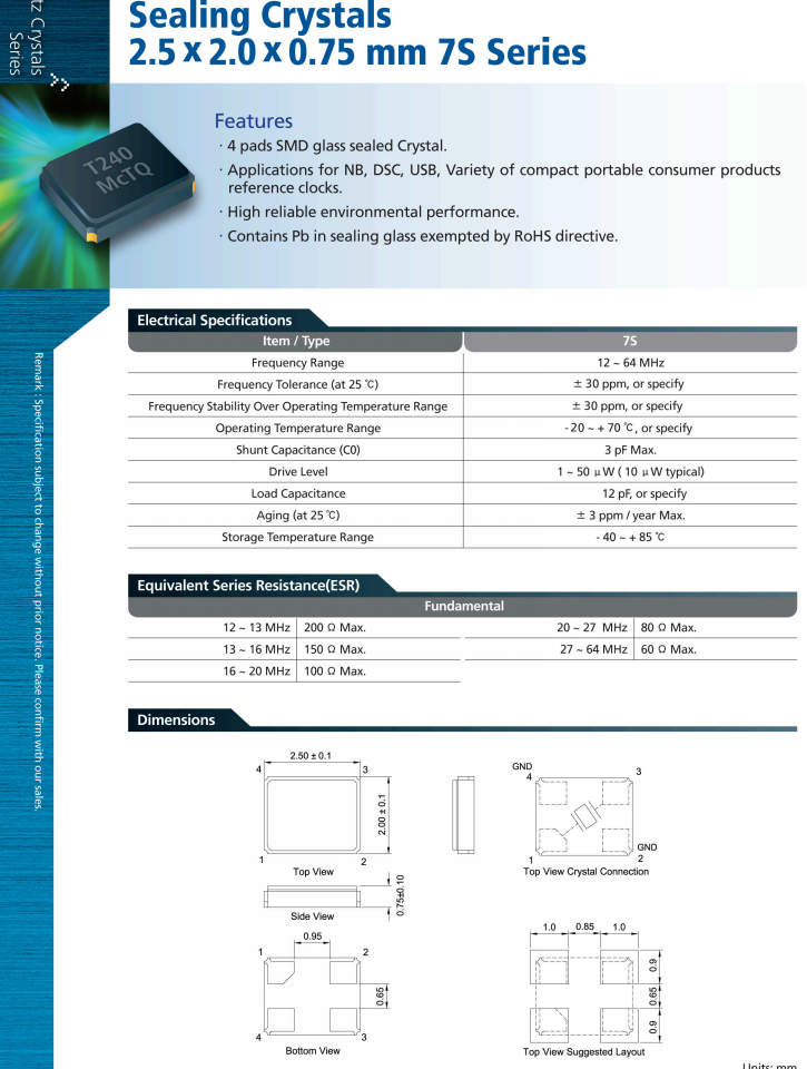 TXC|7S-18.432MAHE-T|18.432MHz|2520|-40~85℃|30PPM,臺灣進口石英晶振,SMD玻璃密封晶體2.5 x 2.0 x 0.75 mm 7S系列。4墊SMD玻璃密封晶體。適用于NB、DSC、USB、各種緊湊型便攜式消費品參考時鐘。高可靠的環(huán)境性能。在被RoHS指令豁免的密封玻璃中含有鉛。
