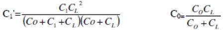 因此,振蕩頻率是由石英諧振器的壓電常量以及振蕩電路中配置的負載電容決定的(工作溫度以及驅動能力分別指定),所以振蕩電路的負載電容必須定義清楚.石英諧振器于串聯(lián)負載電容CL的等效電路如圖-7所示,此時常數(shù)為: