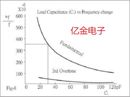 圖8顯示了極品諧振器和第三泛音諧振器的負載電容與頻率變化率的特性.如圖-8所示,為了通過改變負載電容得到寬頻范圍內的變化量,需要使用一個基頻諧振器并選擇一個較小的負載電容.