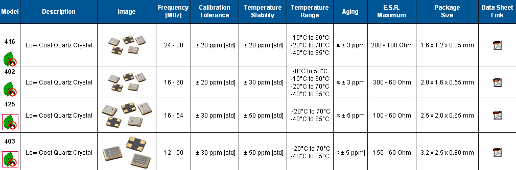 | 頻率公差@ 25°C | ±10ppm, ±15ppm, ±20 ppm, ±30 ppm, ±50 ppm | ||||