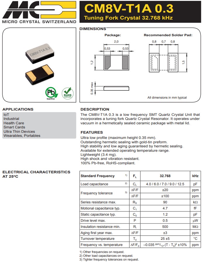 | Micro Crystal | CM8V-T1A-32.768kHz-7pF-100PPM-TA-QC | 32.768 kHz 7.0 pF +/-100 PPM -40/+85C | 32.768 kHz |