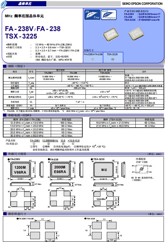 日本進(jìn)口愛普生晶振FA-238和FA-238V,是一款小體積晶振尺寸3.2x2.5mm四腳貼片晶振,無源晶振,石英晶體諧振器,頻率范圍:12MHz至15.9999MHz可以選擇FA-238V晶振,而頻率范圍:16MHz至60MHz之間的頻率可以選型FA-238系列。該產(chǎn)品工作溫度都是-40℃至+85℃(+105℃),都具有超小型,輕薄型,耐熱及耐環(huán)境特點(diǎn),特別適用于小型便捷設(shè)備,通訊模塊,可穿戴設(shè)備,智能手機(jī),平板電腦,便捷式電子儀器,汽車電子,智能家居等。