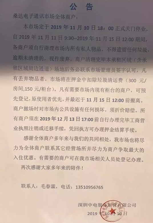 如今,桑達(dá)電子通訊市場(chǎng)即將停業(yè),桑達(dá)電子通訊市場(chǎng)各個(gè)出入口均貼了《公告》,宣布將在11月10日正式停業(yè).該《公告》始發(fā)時(shí)間是2019年10月10日,一個(gè)月后,桑達(dá)電子通訊市場(chǎng)將正式停業(yè)清場(chǎng).