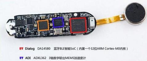 小米手環(huán)內(nèi)部構(gòu)造也很簡(jiǎn)單,前后兩片式外殼,中間嵌入電池、主板與振動(dòng)器,充電觸點(diǎn)設(shè)計(jì)在外殼上.電路板,主要IC,Dialog DA14580 藍(lán)牙片上系統(tǒng),內(nèi)置一個(gè)32-bit ARM Cortex M0內(nèi)核,擁有一個(gè)功率管理模塊; ADI ADXL362 3軸數(shù)字輸出MEMS加速度計(jì),TI TPS62736 降壓轉(zhuǎn)換器.