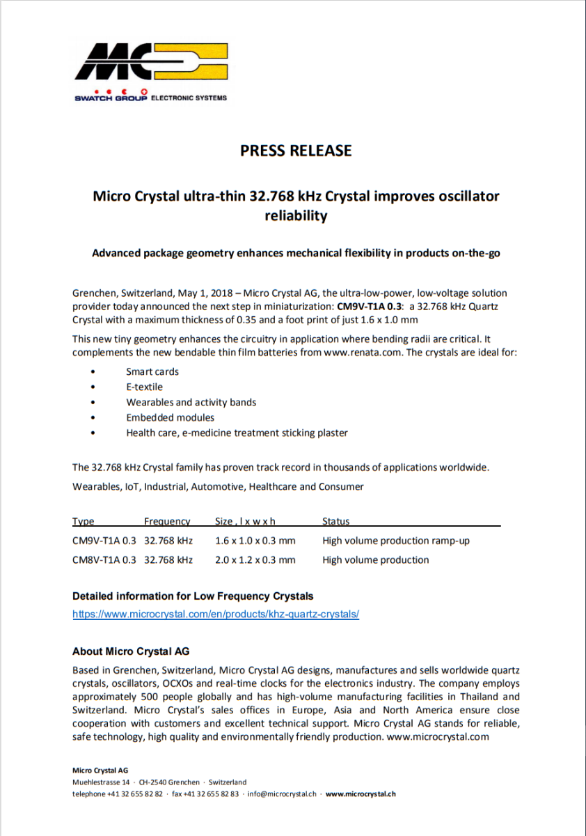 先進(jìn)的晶體幾何形狀可實(shí)現(xiàn)更小的封裝,瑞士格倫興,微晶晶振是世界領(lǐng)先的電子行業(yè)石英晶體、振蕩器、OCXO 和實(shí)時(shí)時(shí)鐘的領(lǐng)先供應(yīng)商,現(xiàn)在提供采用僅 1.2 * 2.0 * 0.7 mm 的先進(jìn)微型封裝的廣受歡迎的振蕩器。這種密封封裝將集成電路與XTAL一起承載。它可承受惡劣的環(huán)境條件。除了大電源電壓范圍外,它還具有非常低的功耗。在有源模式下,驅(qū)動(dòng)一個(gè)CMOS負(fù)載時(shí)功耗低至0 μA。由于振蕩器也以待機(jī)模式(i= 45.1 μA)運(yùn)行,因此可以瞬間獲得準(zhǔn)確的頻率,因此必須注意延遲啟動(dòng)時(shí)間,例如典型的AT振蕩器。通過(guò)工廠校準(zhǔn),精度優(yōu)于使用外部XTAL的解決方案。 1.6 to 5.5 V 的寬電源電壓范圍與 -40°C to + 85°C 的大工作溫度范圍、低功耗和小封裝尺寸相結(jié)合,使其成為未來(lái)應(yīng)用的理想選擇